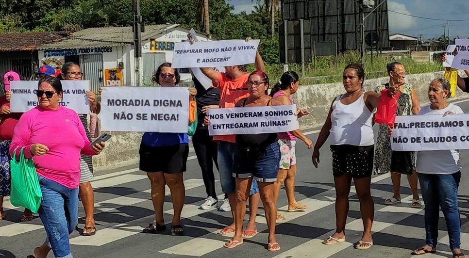 Com faixas e cartazes, os manifestantes denunciaram as condições das moradias. As mensagens exibidas diziam: “Respirar mofo não é viver, é adoecer!”, “Moradia digna não se nega” e “Nos venderam sonhos, entregaram ruínas”. Segundo eles, os problemas de construção comprometem a qualidade de vida das famílias.