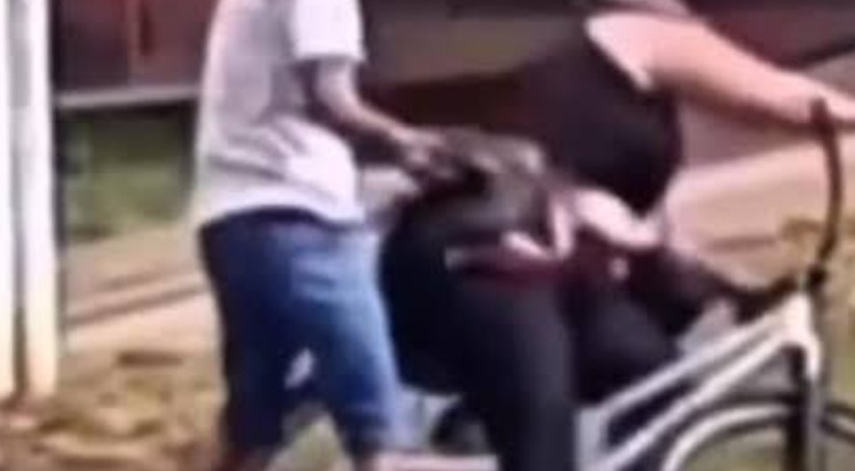 As imagens mostram o momento em que os dois discutem, até que o homem atinge a mulher com uma capacetada. Logo em seguida, ela reage empurrando o agressor, que acaba perdendo o equilíbrio.