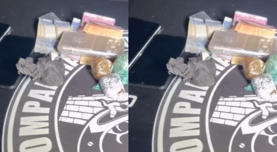 Durante patrulhamento na região, os militares avistaram dois suspeitos em atitude suspeita. Na abordagem, foi constatado que o primeiro indivíduo possuía um mandado de prisão em aberto pelo crime de tráfico de drogas, associação criminosa. Já com o segundo, foi encontrada uma sacola contendo maconha, cocaína, dinheiro trocado, dois aparelhos celulares sem chip e uma balança de precisão, caracterizando o tráfico de entorpecentes.