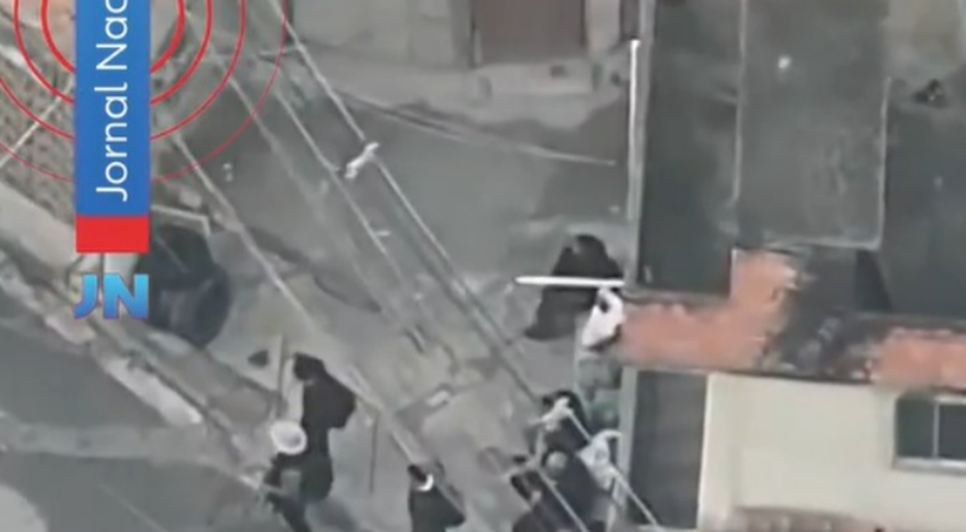 As imagens, captadas por volta das 6h, mostram 23 homens armados, alguns vestidos com fardas camufladas e uniformes semelhantes aos da polícia, o que, segundo os agentes, dificultou a identificação durante o confronto. Pouco depois, o drone registra cerca de 83 criminosos fugindo em direção à área de mata da Serra da Misericórdia, um dos principais focos da operação.