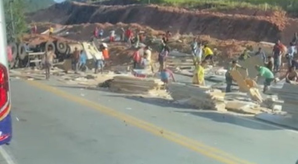 Carreta com MDF tomba na rodovia BR-101, em Joaquim Gomes; populares saqueiam carga