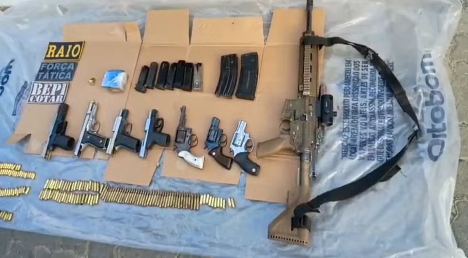 Durante a ação, policiais apreenderam fuzis, pistolas, revólveres, granadas, um veículo e dezenas de munições. O tiroteio ocorreu no bairro Campinas, área dominada por uma facção rival.