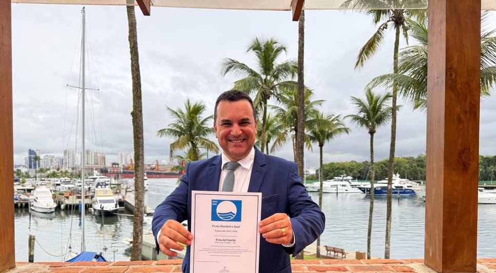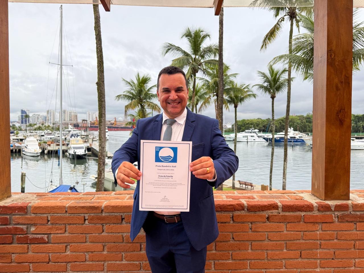 O prefeito Allan de Jesus participou, nesta sexta-feira (31), da cerimônia nacional de entrega da Bandeira Azul 2025, realizada no Iate Club Santos, em Guarujá (SP). O evento reuniu representantes de todo o país para celebrar as conquistas ambientais e turísticas de praias, marinas e embarcações certificadas pelo programa internacional Bandeira Azul.