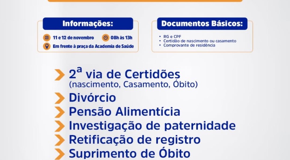Entre os serviços disponíveis estão: emissão de 2ª via de certidões (nascimento, casamento e óbito), divórcio, pensão alimentícia, investigação de paternidade, retificação de registro, suprimento de óbito, alvarás, ações de saúde e direitos do consumidor.