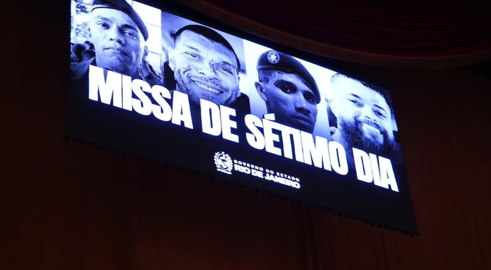 Foi celebrada nesta quinta-feira (6), no anfiteatro do Theatro Municipal do Rio, a missa de sétimo dia dos quatro policiais mortos na Operação Contenção, no dia 28 de outubro, nos complexos da Penha e do Alemão. Os quatro policiais mortos na operação foram: o inspetor Marcus Vinicius de Carvalho, chefe de investigação da delegacia policial de Mesquita, na Baixada Fluminense; o policial civil Rodrigo Veloso Cabral, que tinha sido nomeado há apenas 20 dias e era lotado na delegacia da Pavuna; o militar do Batalhão de Operações Especiais (Bope), Heber Carvalho da Fonseca, de 39 anos; e o sargento do Bope, Cleiton Serafim Gonçalves, de 37 anos.