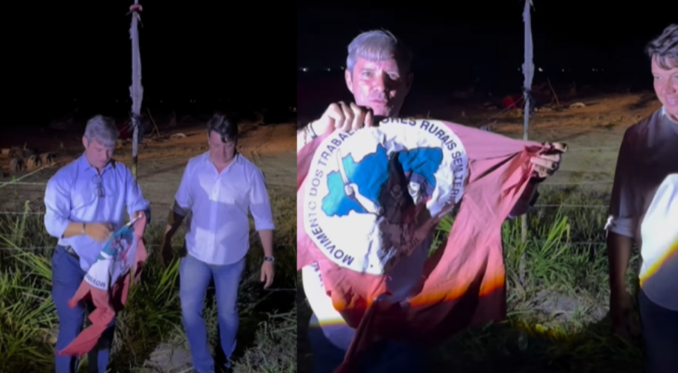 Cabo Bebeto arranca bandeira do MST e comemora desapropriação: “Nosso troféu”
