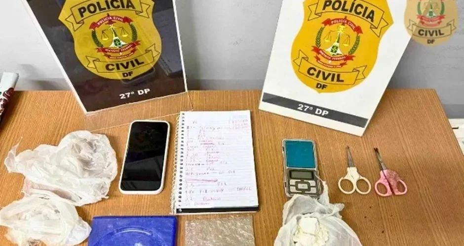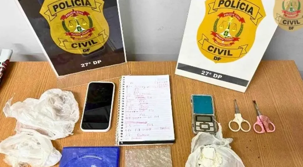 Também foram apreendidas balança de precisão, rolos de plástico filme usados para embalagem, tesouras, caixas plásticas e um caderno de anotações com termos como “peixe” e “skank”, indicando comercialização de drogas.