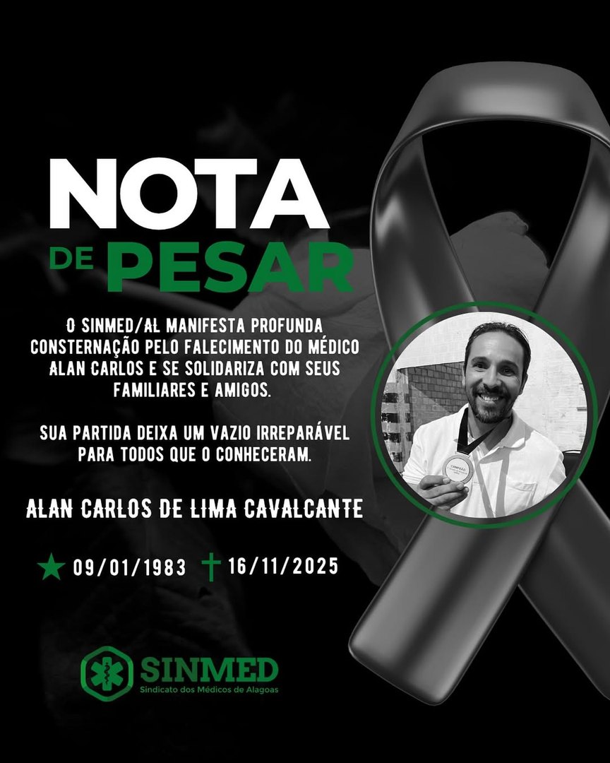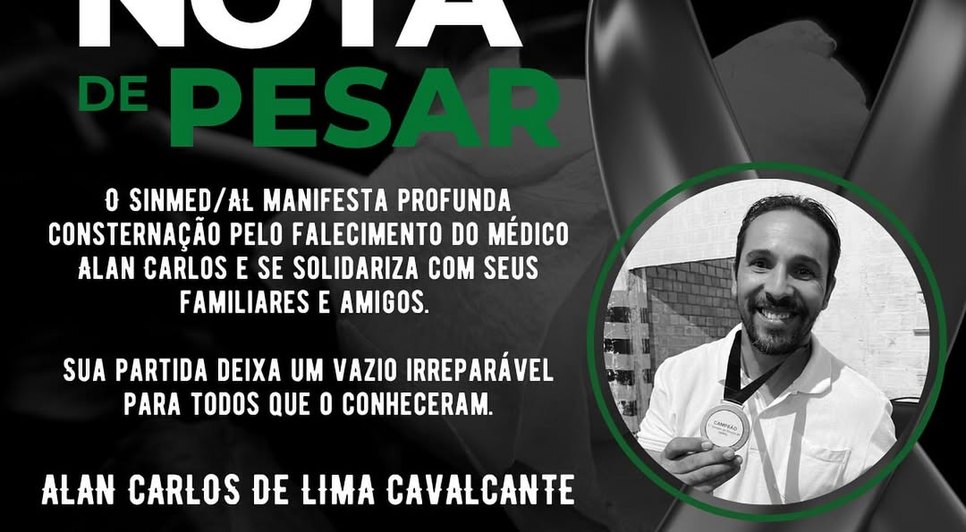 O Sindicato dos Médicos de Alagoas (Sinmed-AL) divulgou nota de pesar pela morte do médico Alan Carlos Cavalcante, assassinado em Arapiraca, neste último domingo (16), pela ex-companheira.