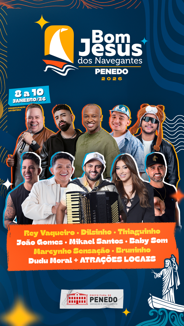 A Prefeitura de Penedo acaba de confirmar a aguardada programação para o tradicional Bom Jesus dos Navegantes 2026, consolidando o evento como um dos pontos altos do calendário cultural nordestino. As festividades musicais acontecerão de 8 a 10 de janeiro na Arena Sinimbu, situada na Orla de Penedo, prometendo reunir grandes nomes da música nacional e dar destaque aos talentos locais. O domingo, dia 11, será dedicado integralmente à programação religiosa, que será anunciada em breve.