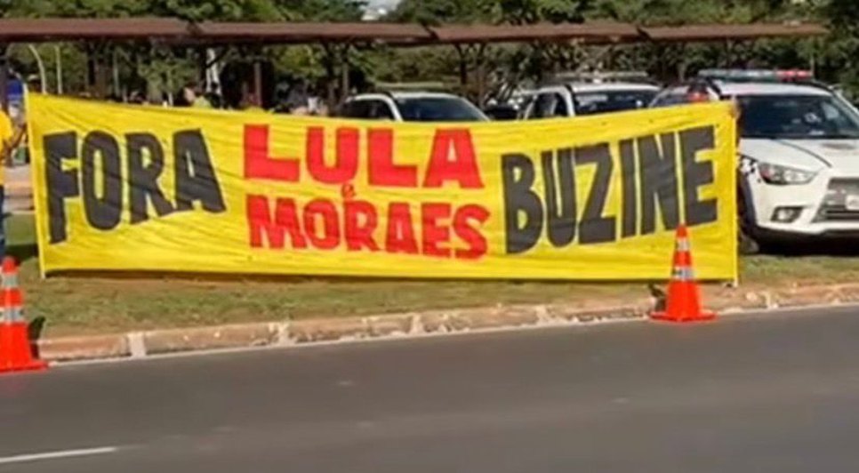 Manifestantes protestam em frente à PF com faixa: "Fora Lula e Moraes"