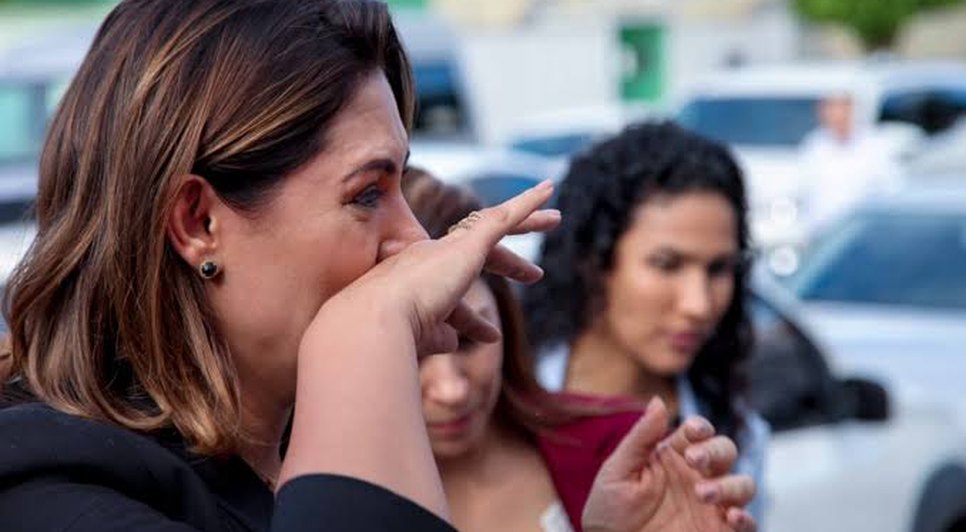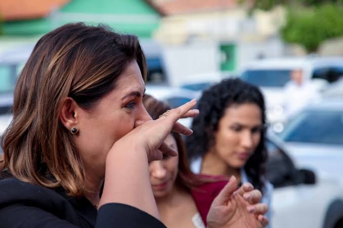 Michelle Bolsonaro chega à sede da Polícia Federal para visitar Jair Bolsonaro, cercada por apoiadores