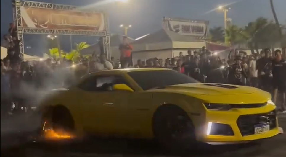 Um Camaro amarelo foi danificado durante um torneio de grau realizado no domingo (23) no bairro do Jaraguá, em Maceió. O evento reuniu carros, motos e paredões de som, atraindo um grande público à região histórica da cidade.