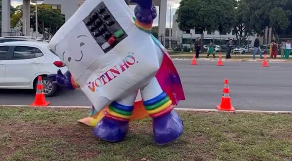 Um grupo LGBTQIA+ realizou um ato em frente à Superintendência da Polícia Federal nesta segunda-feira (24), em Brasília, para comemorar a prisão preventiva do ex-presidente Jair Bolsonaro. A mobilização contou com uma urna eletrônica inflável e com a presença do personagem “Votinho”, criado pela organização VoteLGBT.