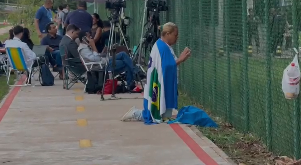 A cena ocorreu nesta terça-feira (25) e chamou a atenção de apoiadores e curiosos que estavam no local. A mulher manteve-se de cabeça baixa durante toda a prece, demonstrando devoção e visível abalo emocional.