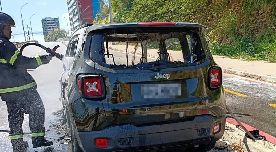 Um Jeep Renegade de cor branca ficou totalmente destruído após pegar fogo na tarde desta quinta-feira (27) na Avenida Josepha de Mello, no Barro Duro, em Maceió. O incêndio ocorreu por volta das 13h e foi registrado por imagens de drone feitas pelo repórter fotográfico Itawi Albuquerque, que mostram o veículo sendo rapidamente consumido pelas chamas até a perda total.