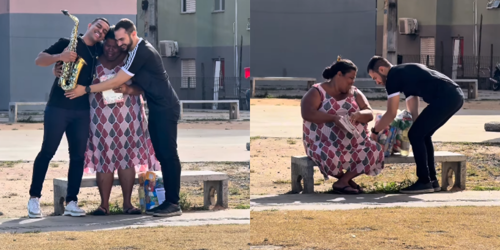 O influenciador digital Felipe Martins publicou nas redes sociais um vídeo que tem emocionado internautas ao mostrar um gesto de solidariedade com uma mulher em situação de vulnerabilidade. Nas imagens, ele se aproxima da mulher, que está sentada em um banco, levando duas cestas básicas.