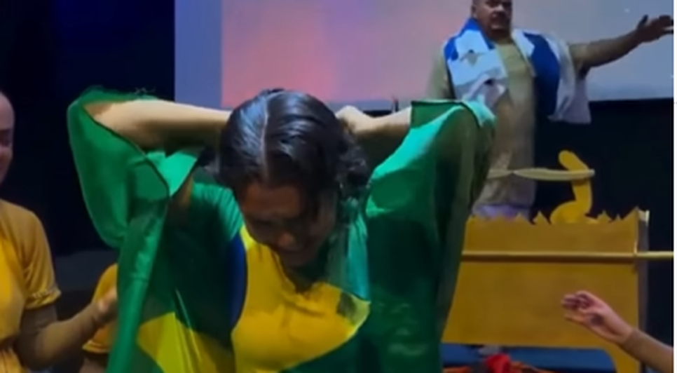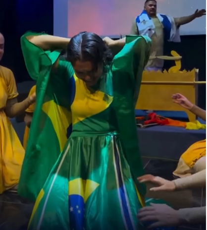 Pastora corta os cabelos enrolada na bandeira do Brasil durante culto