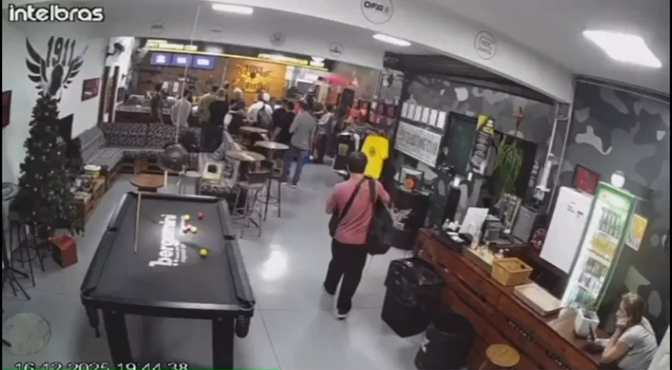 Imagens de câmeras de segurança registraram o momento do ocorrido. A vítima, vestindo uma camisa rosa, entra no local carregando duas bolsas pretas. Em seguida, o pastor, que estava próximo a um balcão, se vira com a arma em mãos e dispara acidentalmente. O homem cai no chão imediatamente.