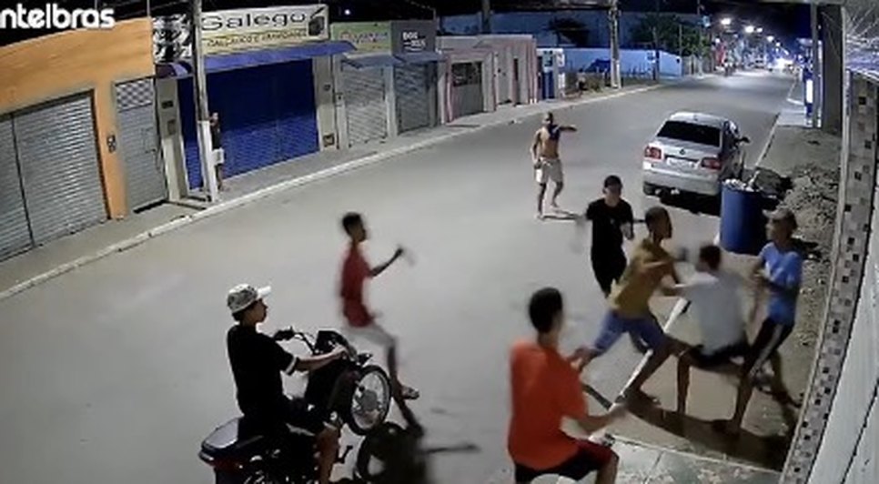 Um vídeo que circula nas redes sociais mostra apenas a confusão e a briga entre os envolvidos. As imagens não registram o momento das agressões com faca.