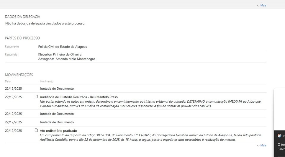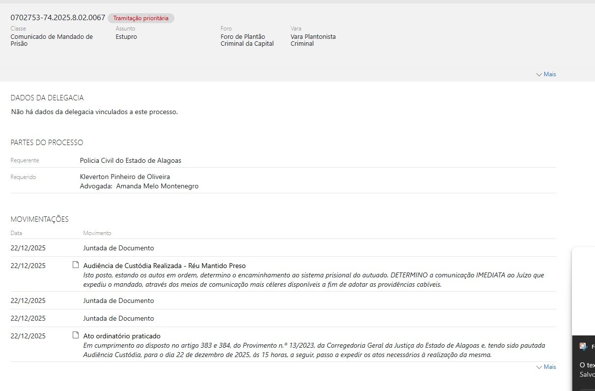 O processo tramita no Foro de Plantão Criminal da Capital, na Vara Plantonista Criminal, e tem como assunto o crime de estupro. A Polícia Civil de Alagoas aparece como parte requerente da ação.