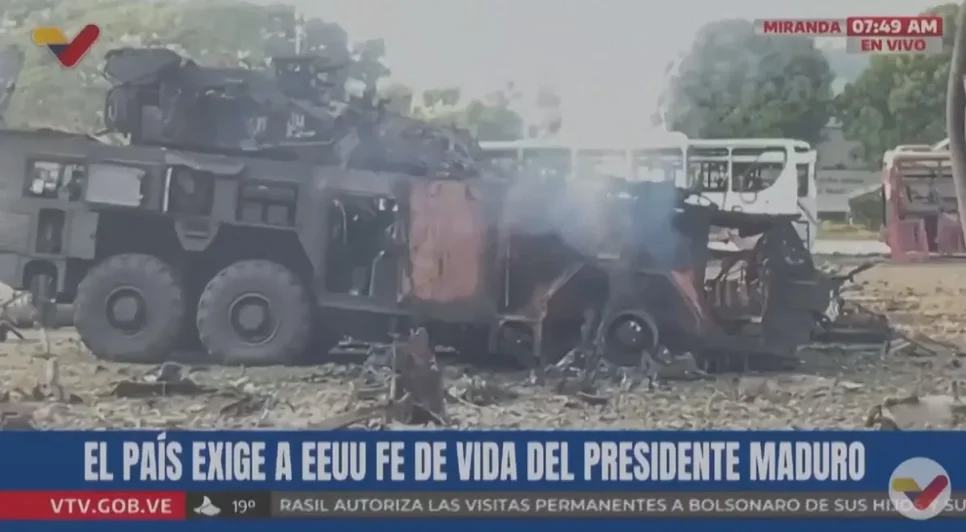 Imagens exibidas ao vivo pela televisão estatal venezuelana mostram diversos veículos destruídos pelas chamas, além de cercas danificadas e colunas de fumaça se espalhando pelo interior da base aérea. O material reforça a dimensão dos ataques, que ocorreram durante a madrugada e atingiram pontos estratégicos da capital.