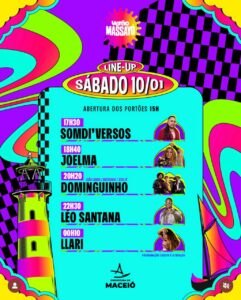 O Verão Massayó segue movimentando a capital alagoana com uma programação diversificada neste sábado (10), no Estacionamento do Jaraguá. A abertura dos portões está prevista para as 15h, e os shows começam a partir das 17h30, reunindo artistas de diferentes estilos musicais em mais uma noite de celebração gratuita promovida pela Prefeitura de Maceió.