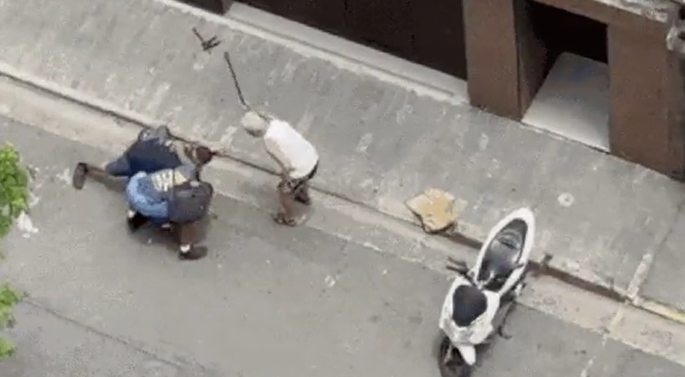 Nas imagens que circulam nas redes sociais, dois homens aparecem segurando o suspeito no chão. Logo depois, um idoso usa uma bengala para atingi-lo, sem confirmação se era a vítima do roubo.