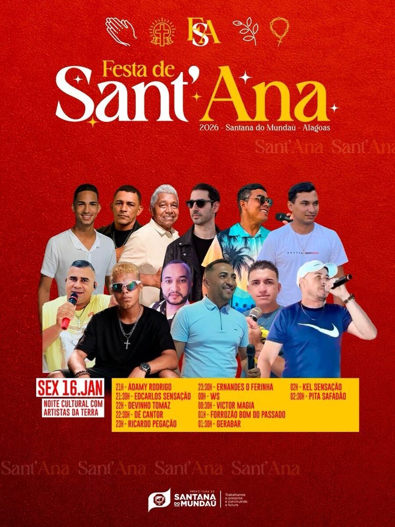 A cidade de Santana do Mundaú inicia nesta quinta-feira (15) as comemorações em homenagem à padroeira Senhora Sant’Ana. Além das celebrações religiosas, a prefeitura preparou uma programação artística que promete animar moradores e visitantes até o domingo (18).