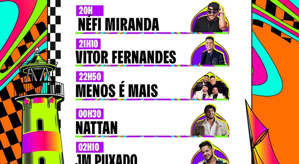 Sobem ao palco: Nefi Miranda, Vitor Fernandes, Menos é Mais, Nattan e JM Puxado. As apresentações começam a partir das 20h.