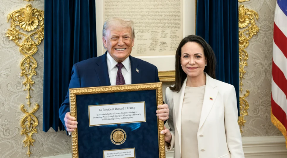 O presidente dos Estados Unidos, Donald Trump, recebeu simbolicamente a medalha do Prêmio Nobel da Paz das mãos da líder da oposição venezuelana María Corina Machado durante uma reunião na Casa Branca nesta quinta-feira (15). A entrega da medalha, concedida a Machado em 2025 pelo Comitê Nobel, foi descrita como um gesto de agradecimento pelo apoio norte-americano à causa pela liberdade na Venezuela.