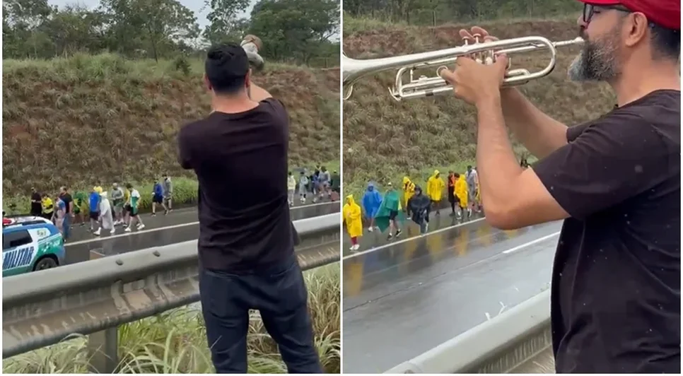 A caminhada promovida pelo deputado federal Nikolas Ferreira (PL-MG) em direção a Brasília foi alvo de provocação nessa sexta-feira (23), durante a passagem do grupo pela BR-040. Um militante ligado ao PT apareceu tocando um berrante e um trompete em frente aos manifestantes bolsonaristas e publicou o vídeo nas redes sociais com a frase: “Cuidado! Tem gado solto na pista”.
