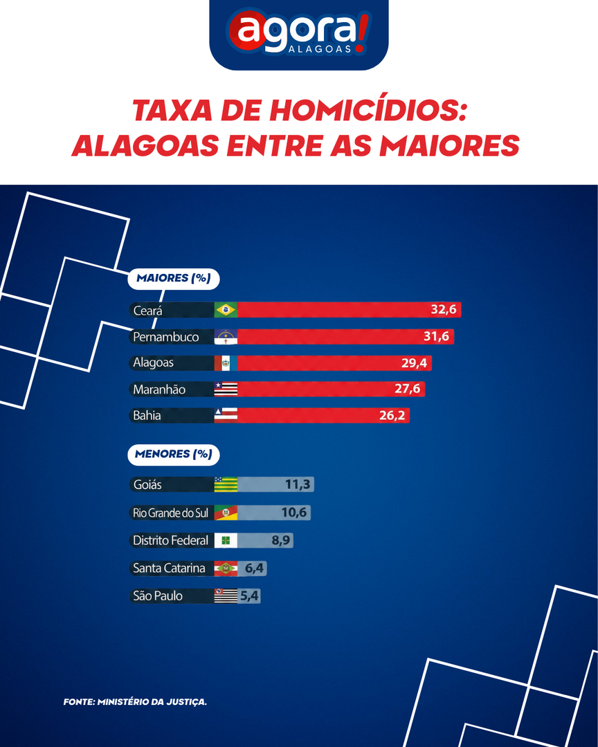 Entre os estados, Alagoas figura entre os que mais registraram mortes violentas no ano, com 946 vítimas, o que representa quase três mortes por dia, posicionando o estado em uma das posições mais elevadas no contexto nacional.
