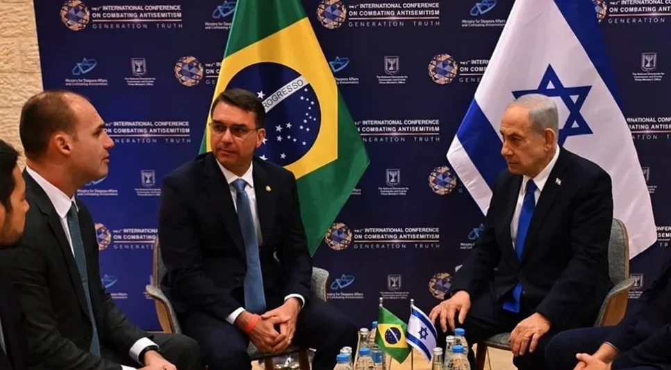 Na última segunda (26), o senador e pré-candidato à presidência, Flávio Bolsonaro, se encontrou com o primeiro-ministro de Israel, Benjamin Netanyahu, durante a Conferência Internacional de Combate ao Antissemitismo, em Israel.