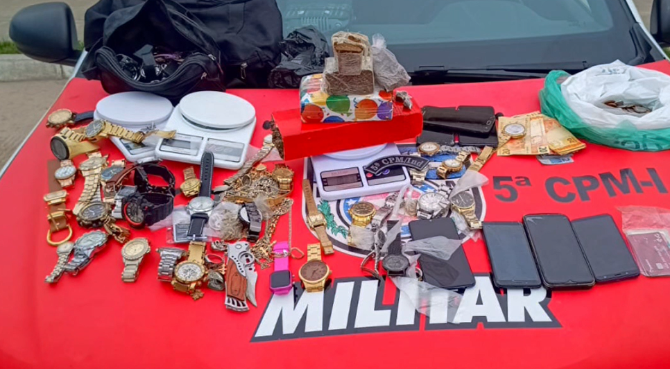 A guarnição realizou buscas na residência, onde localizou mais entorpecentes, relógios, aparelhos celulares e joias, materiais que seriam provenientes da atividade ilícita. O homem foi conduzido à Central de Flagrantes para os procedimentos legais cabíveis.