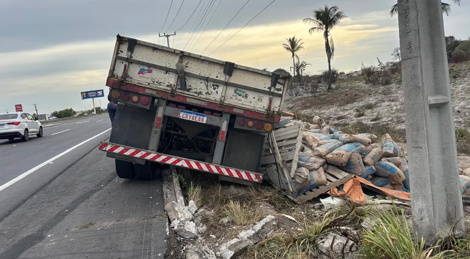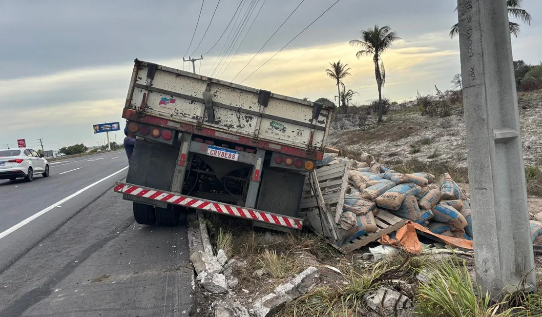 Um caminhão que transportava carga de cimento tombou nesta quarta-feira (28) na rodovia AL-101 Sul, no trecho entre a Praia do Francês e o município de Barra de São Miguel, no Litoral Sul de Alagoas. O acidente ocorreu em uma área de grande fluxo e despertou a atenção de motoristas que passavam pelo local.