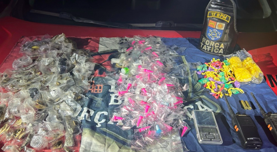 Após consulta, foi constatado que o acusado possuía mandado de prisão em aberto pelo crime de homicídio. Com ele, os militares apreenderam maconha, cocaína, crack e um rádio comunicador. O homem foi preso e encaminhado à Central de Flagrantes, onde foram adotados os procedimentos legais cabíveis.