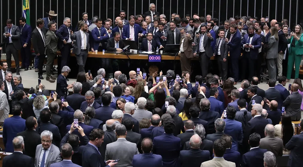 Após a prisao domiciliar do ex-presidente Jair Bolsonaro, parlamentares de direita bloquearam o plenário por mais de 30 horas. O senador Magno Malta chegou a se algemar a cadeira para não deixar a Mesa.