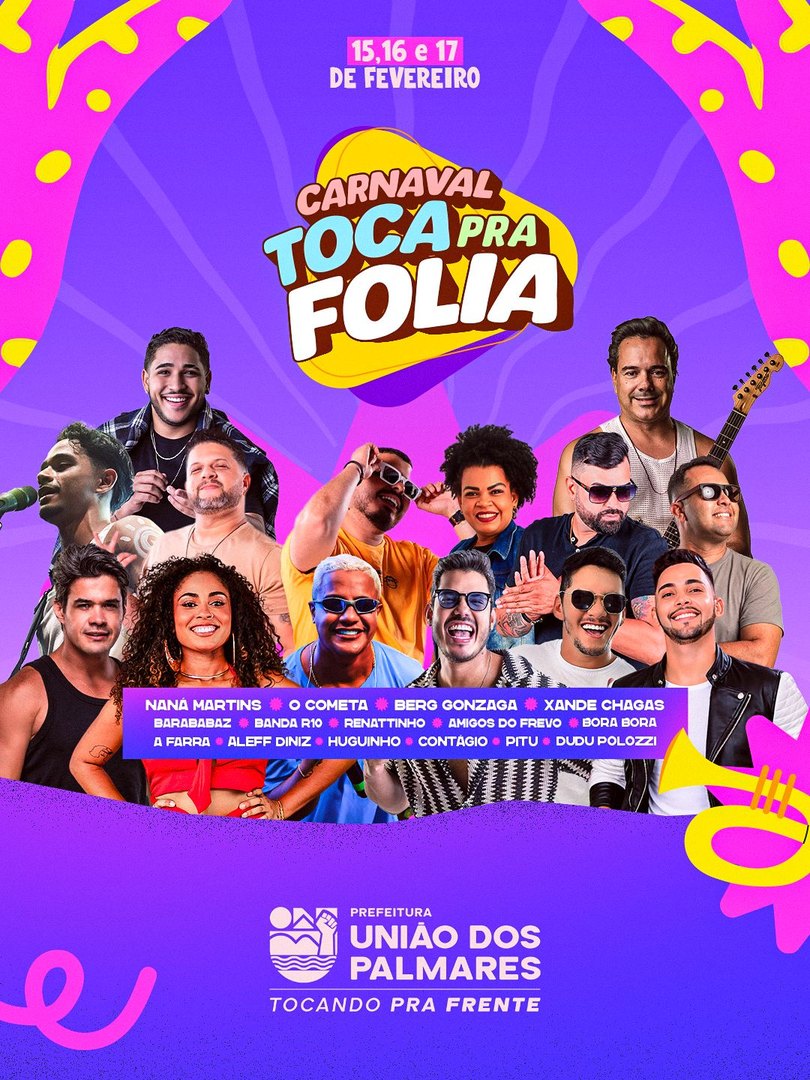 A Prefeitura de União dos Palmares lançou oficialmente a programação do Carnaval 2026, consolidando mais uma edição do Toca pra Folia, iniciativa que reafirma o compromisso da gestão municipal com o fortalecimento da cultura, o incentivo aos blocos carnavalescos da terra e a valorização dos artistas locais.