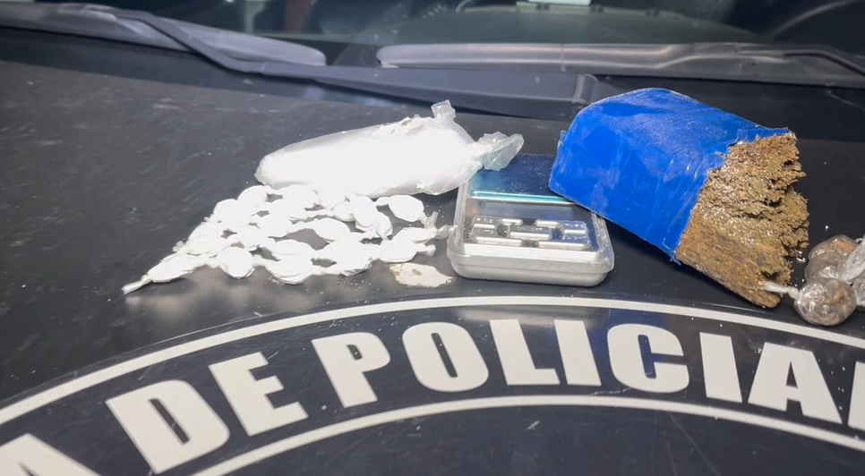 Com o suspeito, os policiais apreenderam porções de cocaína e maconha, além de uma balança de precisão. O material estava em posse do indivíduo no momento da abordagem.