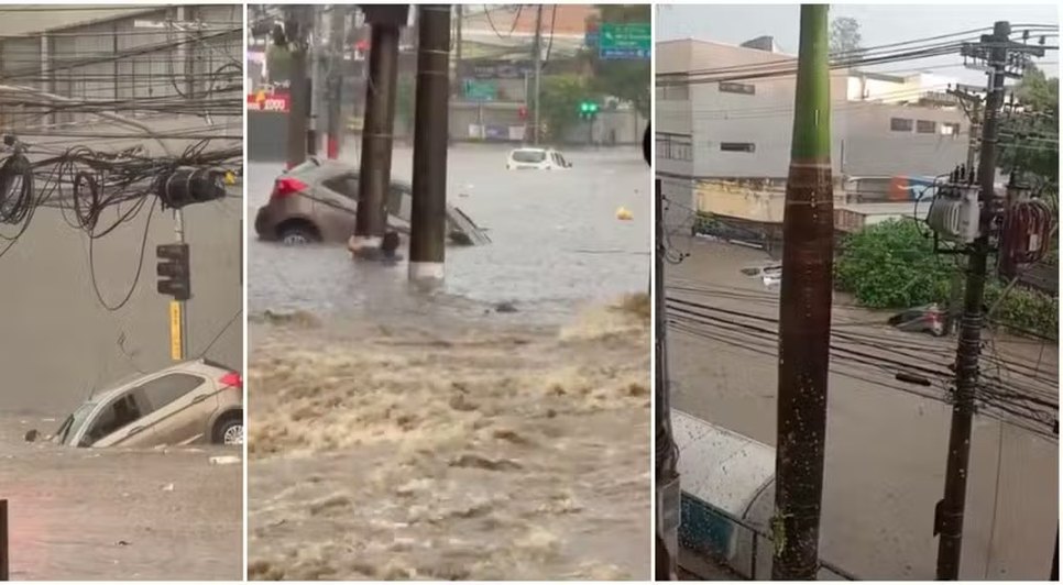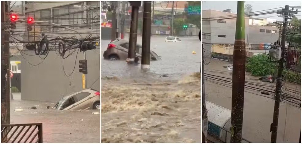 Uma motorista precisou se agarrar a um poste para não ser levada pela enxurrada durante o forte temporal que atingiu a capital paulista e a Grande São Paulo nesta segunda-feira (16).