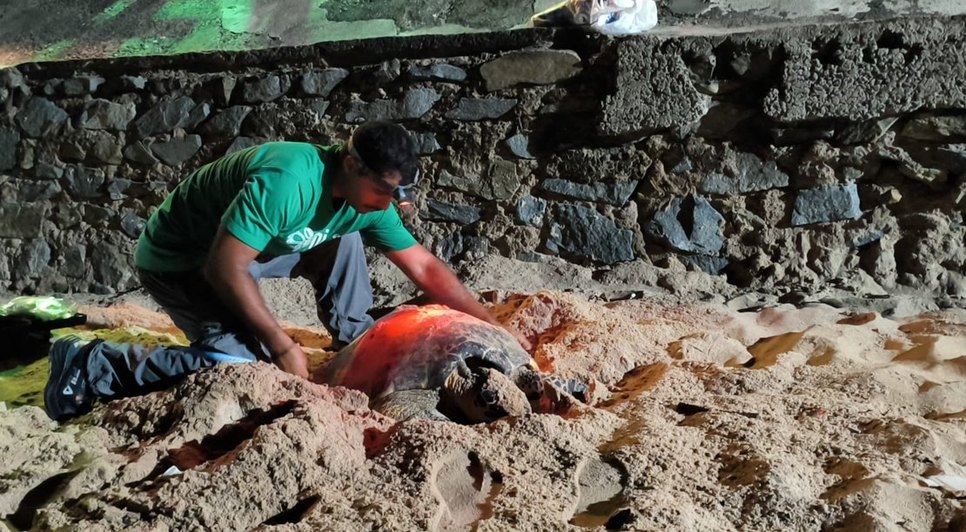 Fêmea de tartaruga se assusta com aproximação humana durante desova