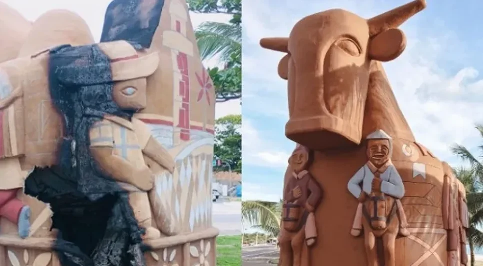 Nesta semana, a escultura “Boi Bumbá”, localizada na Praia da Avenida, em Maceió, de autoria do mestre artesão João das Alagoas, foi vandalizada. Imagens mostram que a escultura foi parcialmente queimada.