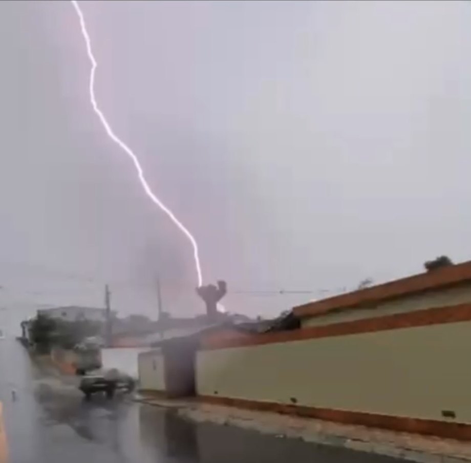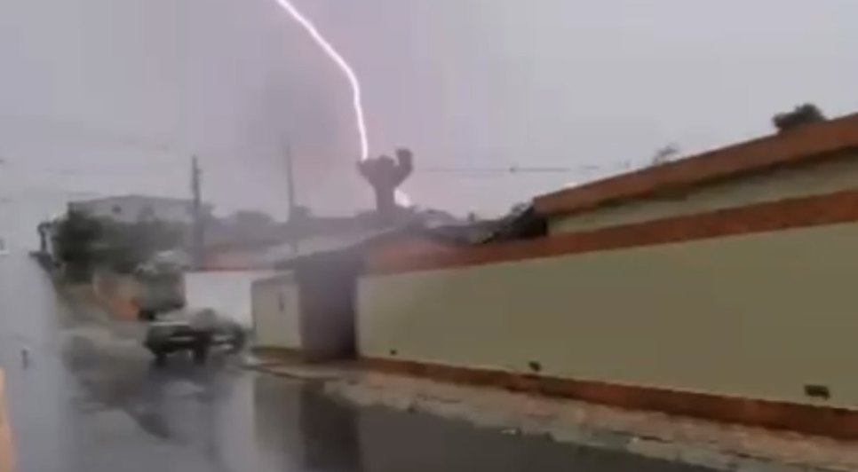 O vídeo foi publicado nas redes sociais e mostra a rua sendo tomada pela água. Durante a gravação, um raio aparece de forma repentina, causando surpresa no morador que fazia o registro.