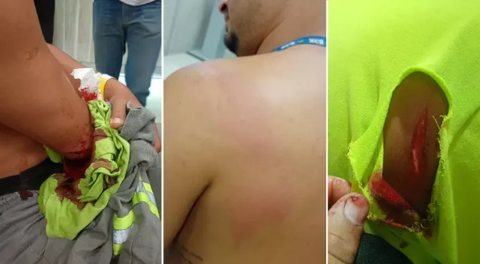 No vídeo, o suspeito aparece avançando contra os funcionários em plena via pública. Durante o ataque, dois trabalhadores são atingidos nas mãos enquanto um terceiro acaba ferido nas costas.