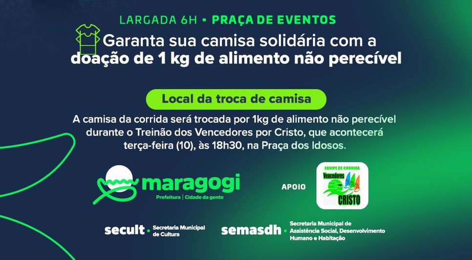 A Prefeitura de Maragogi reforça o convite para que moradores e visitantes participem da atividade, promovendo um momento de integração, incentivo à prática esportiva e apoio às ações solidárias desenvolvidas no município.