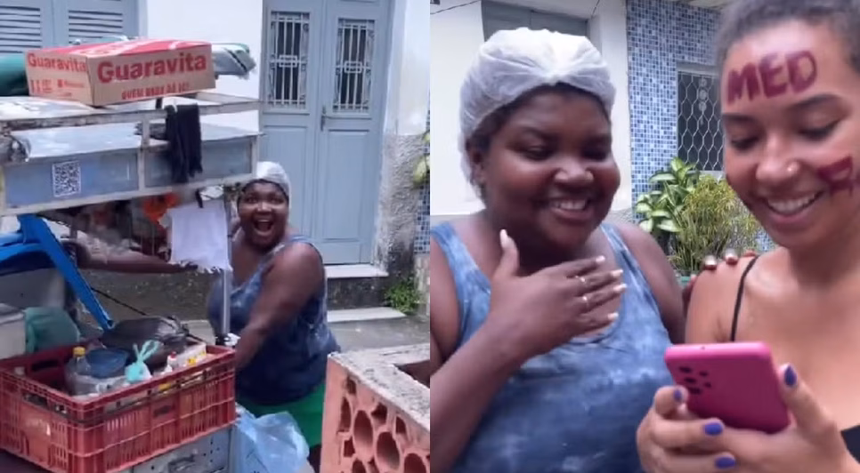 Nas imagens, a mãe da estudante, Eliene Bezerra, descobre que o esforço de anos finalmente deu resultado. Há cerca de uma década, ela sustenta a família vendendo lanches no Centro do Rio de Janeiro, trabalho que ajudou a custear os estudos da filha e possibilitou que Ana Beatriz se preparasse para o concorrido vestibular de Medicina.