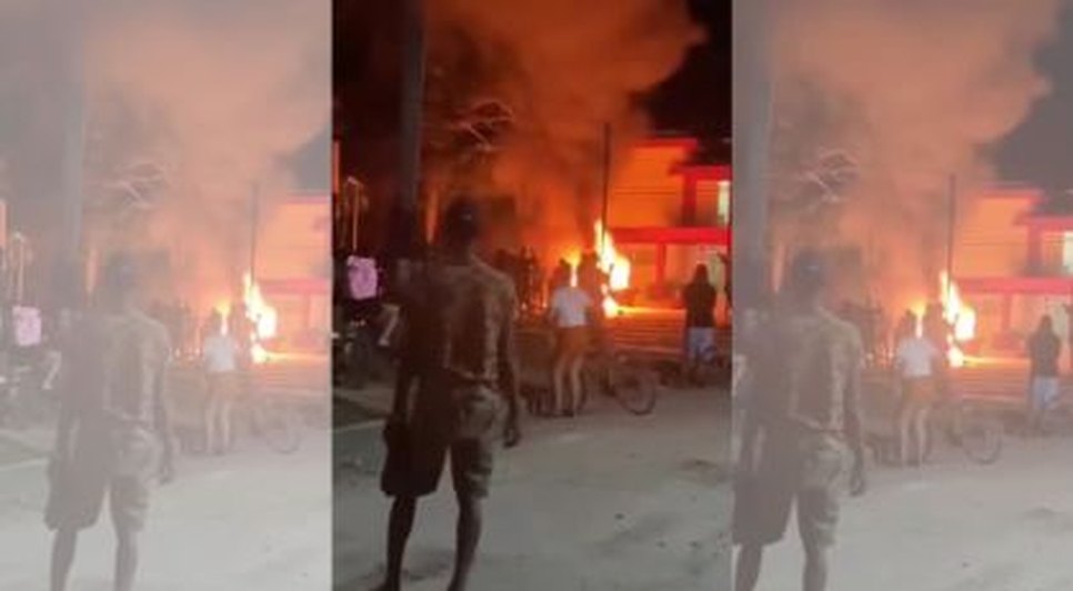 Vídeos que circulam nas redes sociais mostram um incêndio de grandes proporções e manifestantes arremessando pedras contra as janelas de um prédio enquanto gritam “liberdade”.