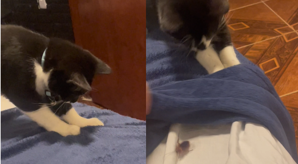 Inicialmente, a dona não percebeu do que se tratava e observava o comportamento do animal. No entanto, ao ser revelado do que se travava, ela descobriu que o gato estava brincando com uma barata, o que provocou uma reação imediata de surpresa.