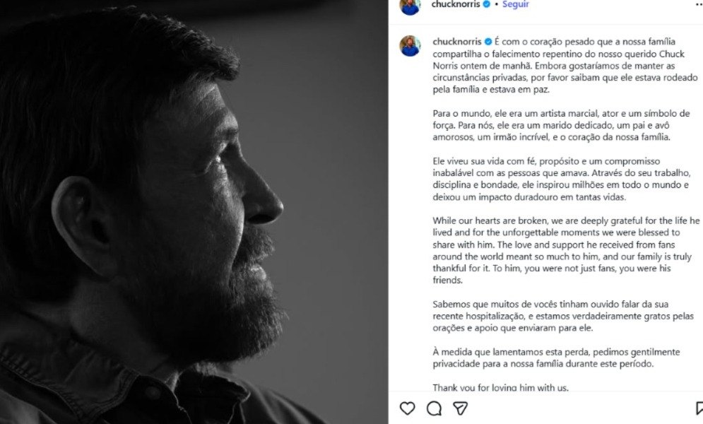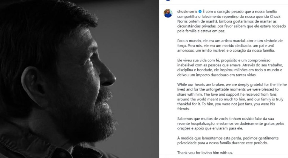 O ator e artista marcial Chuck Norris morreu na manhã de quinta-feira (19), no Havaí, aos 86 anos. A informação foi divulgada por meio de uma publicação no perfil oficial do artista nas redes sociais, confirmando o falecimento.