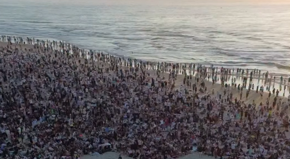 Multidão cristã forma cruz gigante em praia